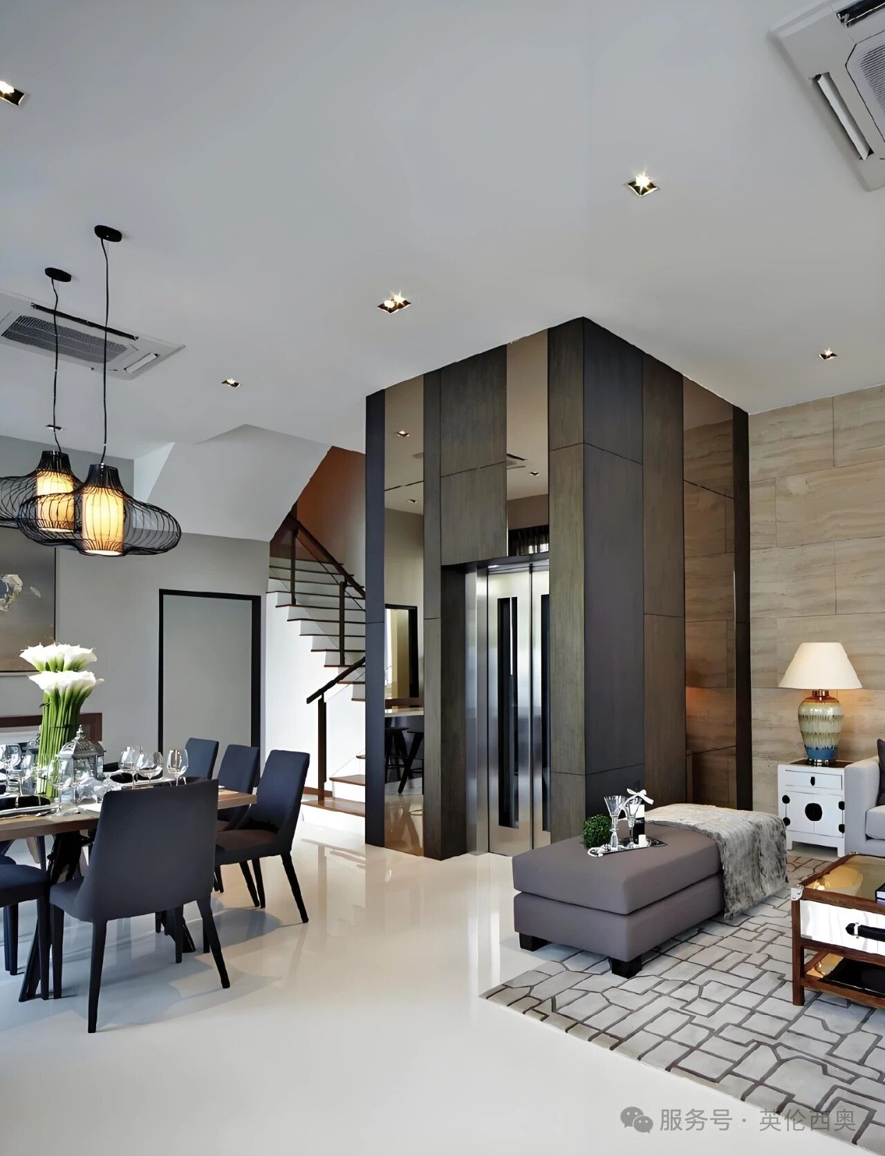 首先是统一色系,融入整体。电梯井道或电梯门的颜色,需与别墅装修主色调保持一致,才能避免突兀感。若家里是现代欧式风,搭配暖金色井道,温润的金属光泽能呼应软装的精致感,让空间更显温馨雅致;若是现代极简风,选择哑光黑井道或电梯门,利落的线条搭配沉稳色调,能瞬间强化空间的简约大气,与整体风格无缝衔接。
